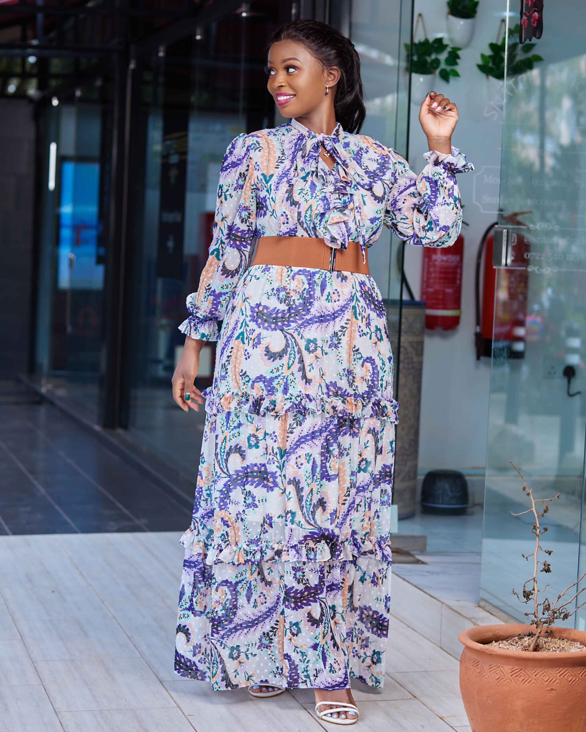 High neck purple and white maxi